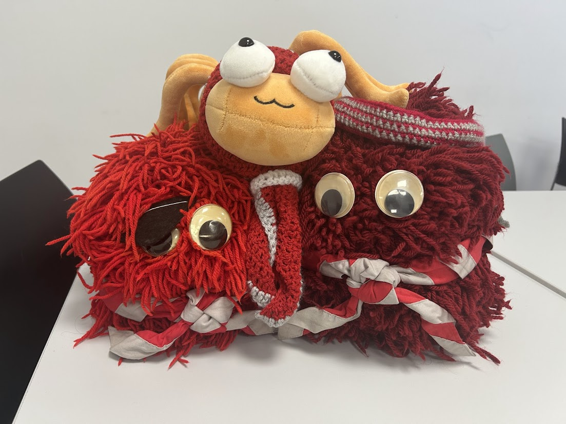 ShiT's babies are stealable, they're much smaller multi-coloured pom-pom spiders and are carried by Lancaster SSAGO members. We're not huge fans of mascot stealing because we lovingly make our own mini-ShiTs so please be nice to us!